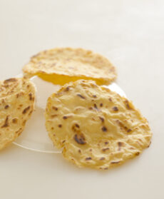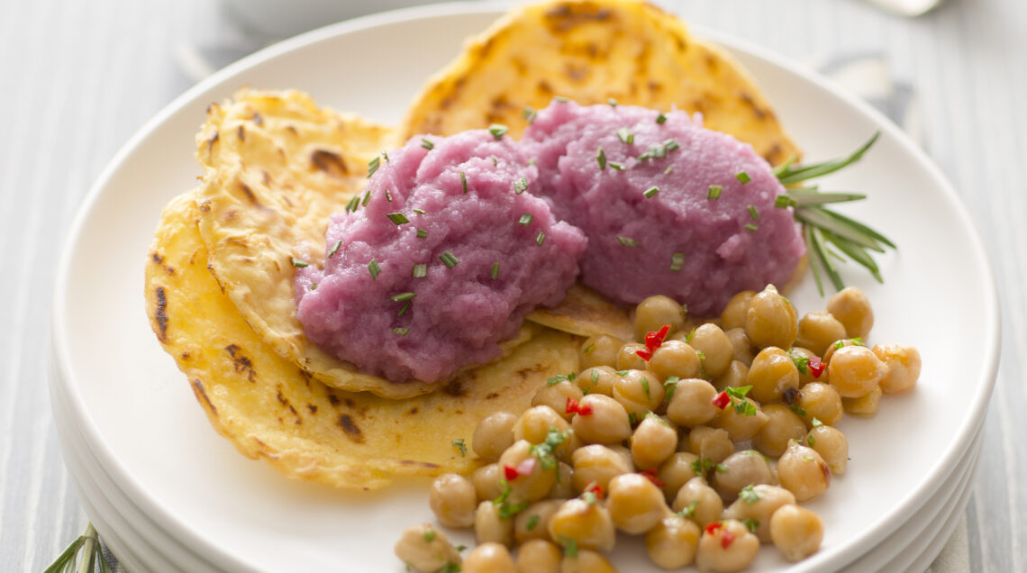 La purea dolce e morbida di cipolle incontra la croccantezza delle cialde di legumi. Un connubio con una piacevole nota piccante che stuzzica il palato