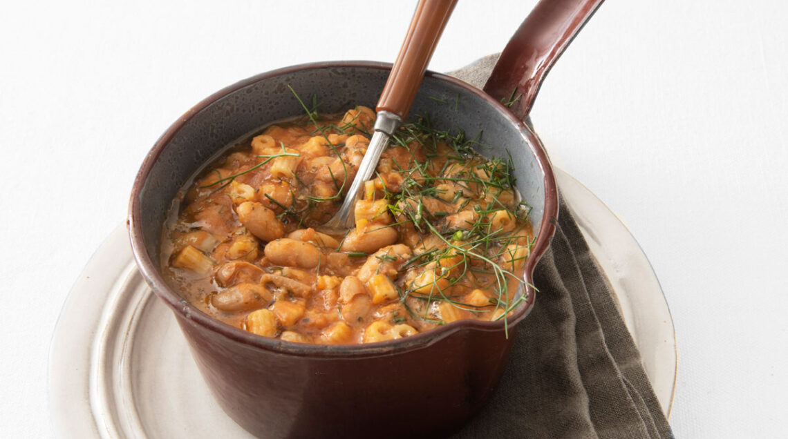 1) Metti i fagoli in ammollo per una notte in abbondante acqua. Sgocciolali e cuocili in 2 litri di acqua (non usare quella di ammollo) con 2 coste di sedano e qualche foglia di basilico per 45 minuti. Intanto, lava, pulisci e trita il sedano rimasto, la carota e la cipolla.Soffriggili nell’olio insieme alla pancetta e poi unisci la polpa di pomodoro passandola al passaverdura e facendola cadere direttamente nel soffritto. Aggiungi il finocchietto e 1 bicchiere di acqua calda, sala, pepa e prosegui la cottura per 20 minuti.