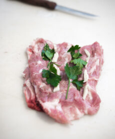 Allargate la fetta di carne sul tavolo e allineate al centro la parte bianca di 1 costola di sedano ridotta a listarelle, lo spicchio d'aglio tagliato a filetti e una manciata di foglie di prezzemolo