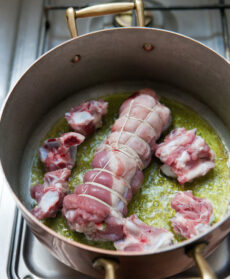 Fate dorare l'arrostino ottenuto in 2 dl di olio, unite gli ossi, lasciate insaporire.