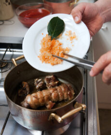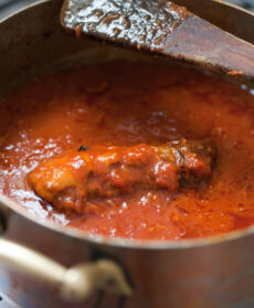 Il collo disossato che arricchisce questo goloso sugo rosso è di fatto un irresistibile rollè, da servire a fette accanto alla pasta o addirittura come secondo.