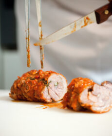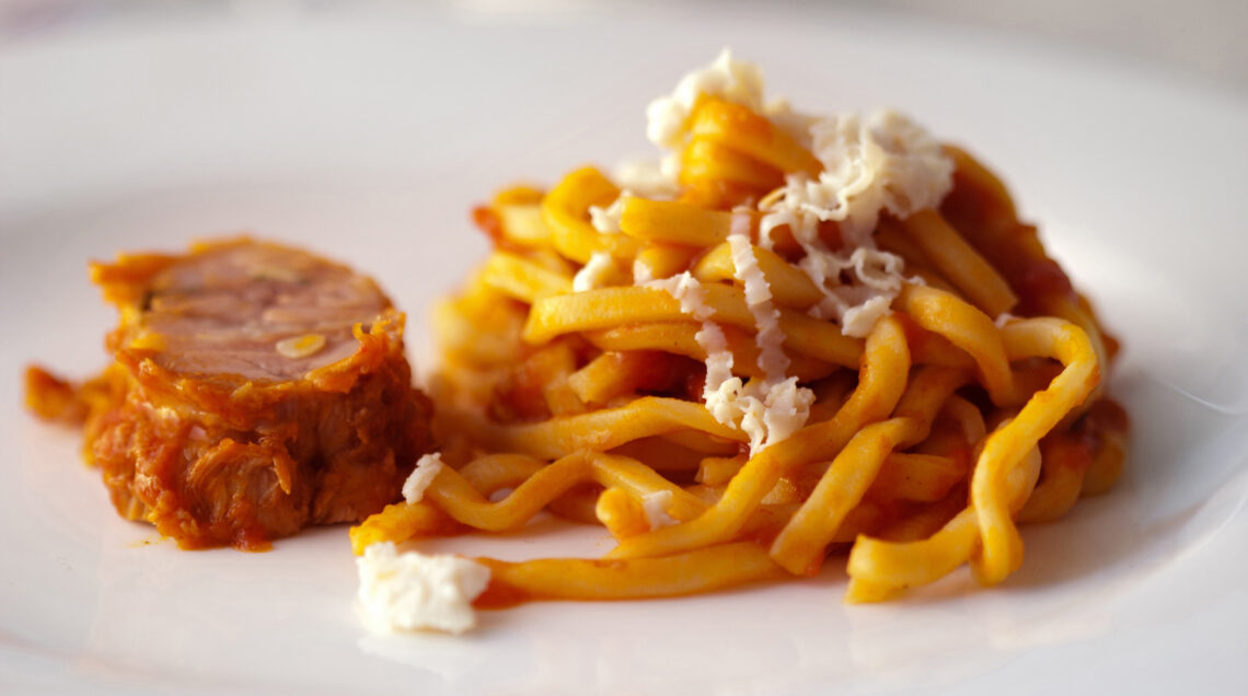 Il collo aperto a libro è farcito con sedano, aglio e prezzemolo e legato a rotolo. Cotto nel sugo di pomodoro regala un ragù particolare, molto saporito. Un primo ricco che è quasi un piatto unico: una grattugiata di ricotta e il piatto diventa un fuoriclasse