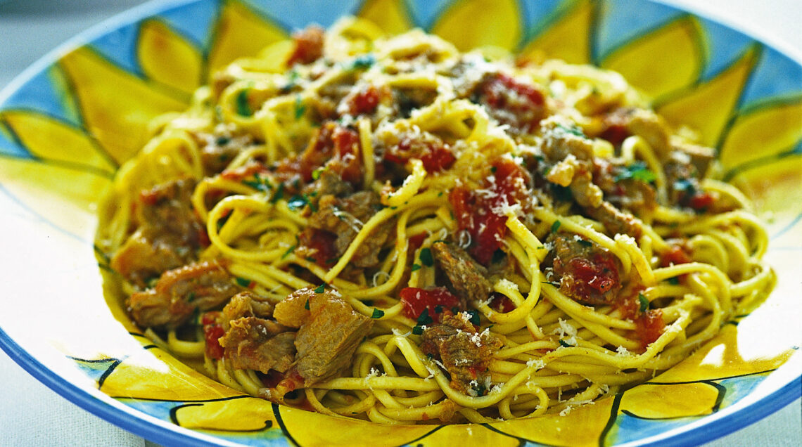 2) Togli l’agnello dal tegame e togli l’aglio; disossa i pezzi di agnello, taglia la polpa a pezzetti, mettili nel tegame insieme al prezzemolo tritato e cuoci per altri 10 minuti. 3) Prendi la pasta e lessala in acqua bollente e salata, scolala piuttosto al dente, condiscila insieme al ragù e abbondante grana grattugiato e mescola.