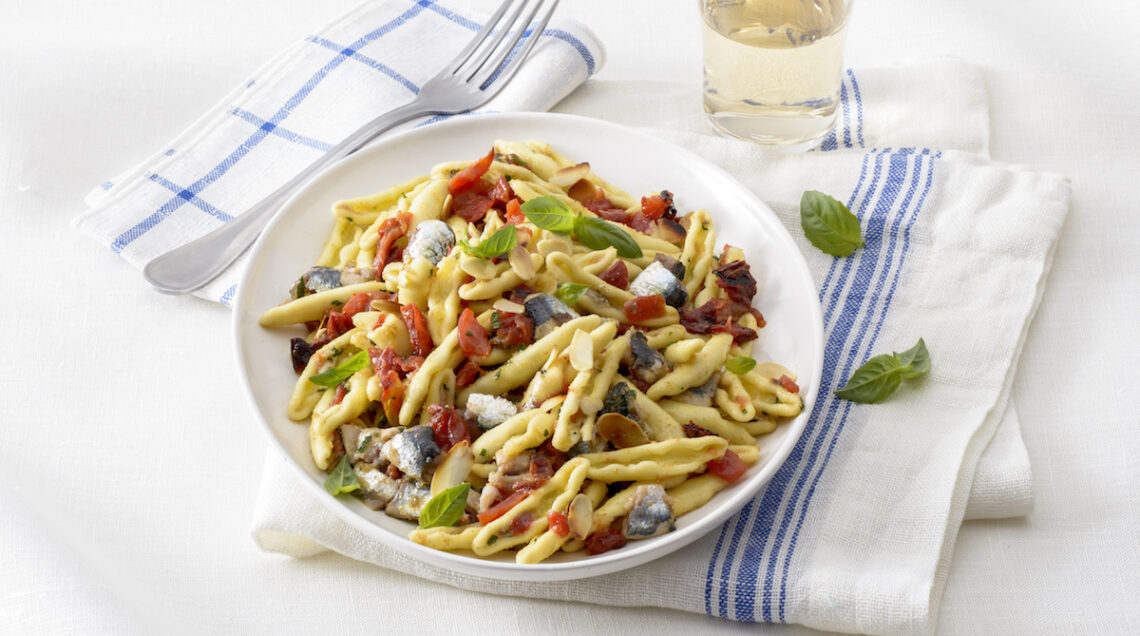 Un primo piatto pugliese a base di pasta fresca, pesce azzurro e verdure di stagione. Sfizioso e colorato, porta in tavola i sapori e i profumi mediterranei