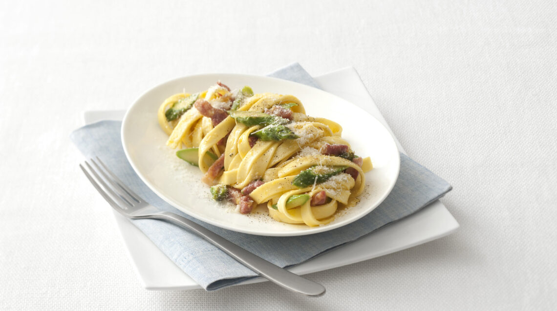 Intanto lessate le tagliatelle in acqua bollente salata e preparate la salsa per condire: stemperate la toma con la panna e poi unite i tuorli, il parmigiano e una macinata di pepe. Sgocciolate le tagliatelle, versatele nella padella con gli asparagi e saltatele brevemente. Togliete dal fuoco, unite la salsa alle uova e formaggio, mescolate e servite. Se vi piace, condite con altro parmigiano.