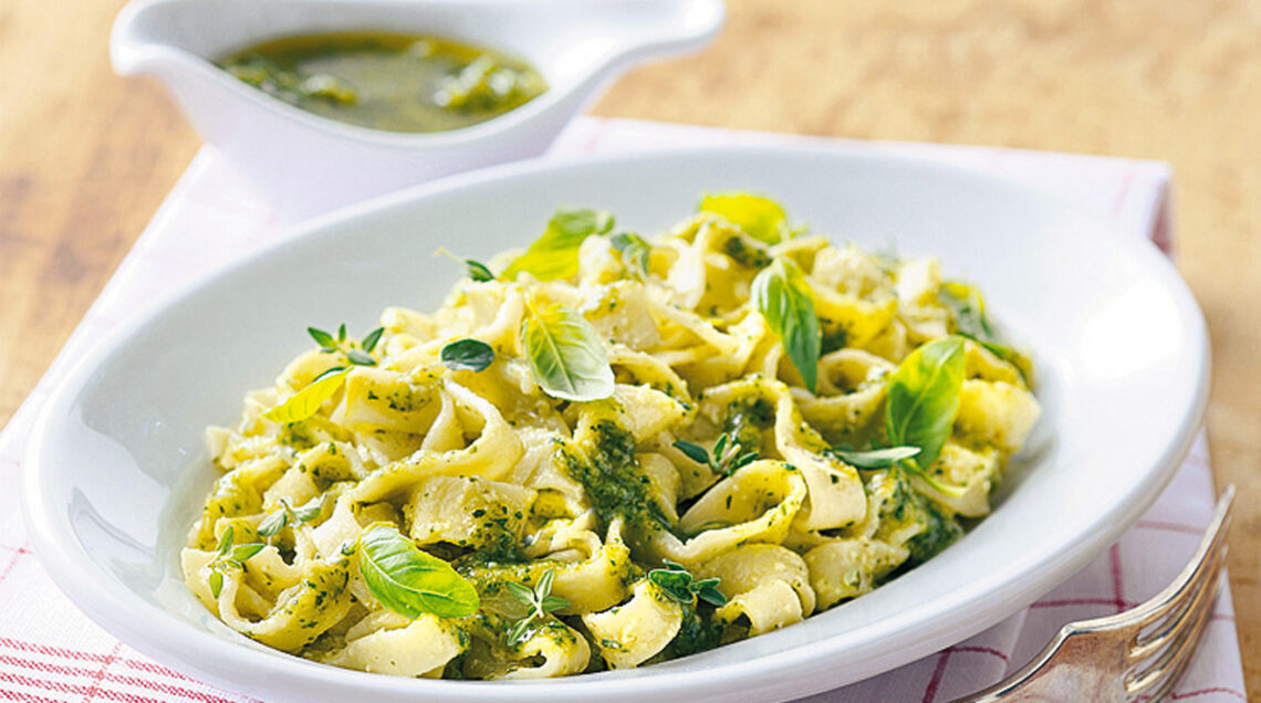 2) Riunisci nel mixer le erbe aromatiche: le foglie di basilico, maggiorana, timo e origano. Aggiungi anche il pecorino e il grana grattugiati, i pinoli, i gherigli di noce tritati grossolanamente, lo spicchio d’aglio, un po’ di peperoncino in polvere e una presa di sale. Frulla gli ingredienti e versa a filo circa 1 dl di olio extravergine di oliva. Lavora gli ingredienti fino a ottenere un pesto omogeneo. Spegni il mixer e tieni da parte la salsa che condirà le ceriole.