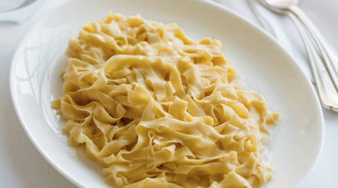 Fettuccine all'uovo fatte in casa e sapientemente condite con burro e Parmigiano grattugiato: un piatto semplice ma talmente buono da essere apprezzato anche Oltreoceano