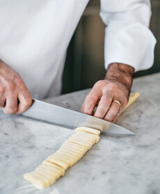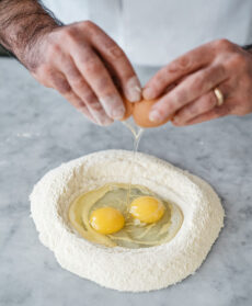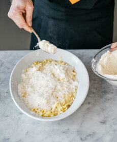 Oltre alla preparazione della pasta fresca all'uovo, il segreto sta nella mantecatura che deve avvenire a tempo di valzer, cioè in tre tempi: versate la pasta sul burro assieme a un po' di acqua di cottura e mescolate. Spolverizzate con il formaggio coprendola interamente e infine mescolate con fino a ottenere una salsina cremosa e liscia.