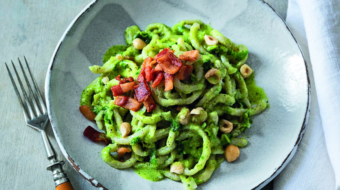 Una variante con le nocciole della classica salsa genovese per questa pasta fresca home made preparata con farina di grano tenero