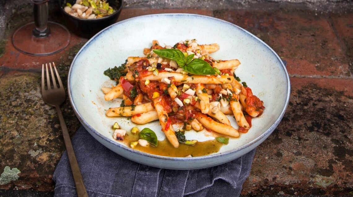 Il classico pesto alla siciliana è fatto con pomodori ramati, ricotta, pinoli e tanto basilico, ma la ricetta tradizionale subisce spesso le influenze territoriali che apportano piccoli cambi nella preparazione del condimento. In questa versione, per esempio, i pomodori sono cotti e aggiunti alla fine assieme al basilico e al formaggio e compaiono le mandorle, secondo l'usanza di Trapani, tostate per intensificarne l'aroma e frullate con i pistacchi, un vero must in Sicilia. Il pesto diventa così piacevolmente granuloso, di sapore gentile e avvolgente, anche con la pasta secca.