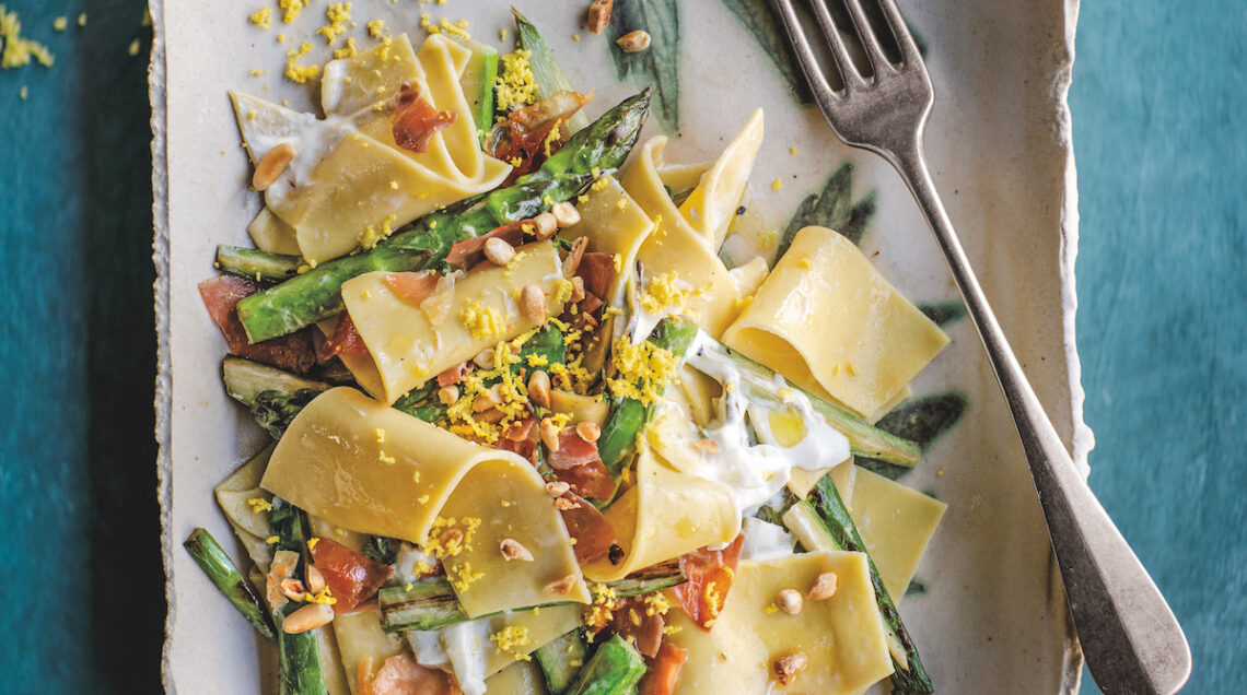 Maltagliati con asparagi, burrata, pinoli e prosciutto