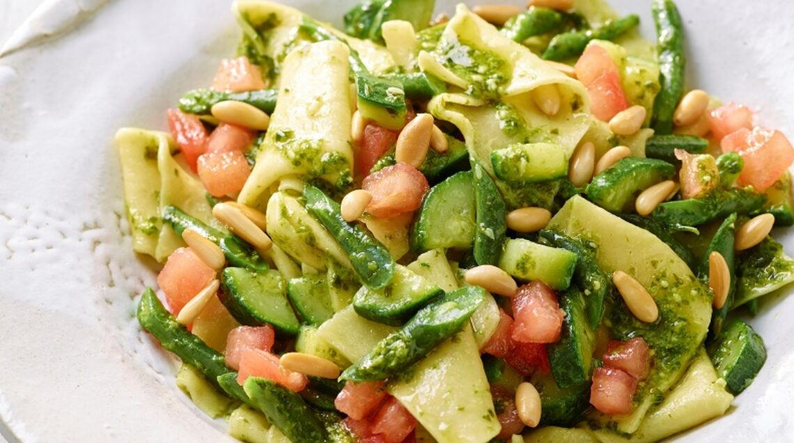 1) Mondate zucchine e fagiolini; tagliate le prime a rondelle e i secondi a tocchetti. Scottate i pomodori in acqua bollente salata, eliminate buccia e semi e riduceteli a dadini. Tostate i pinoli in una padella antiaderente.