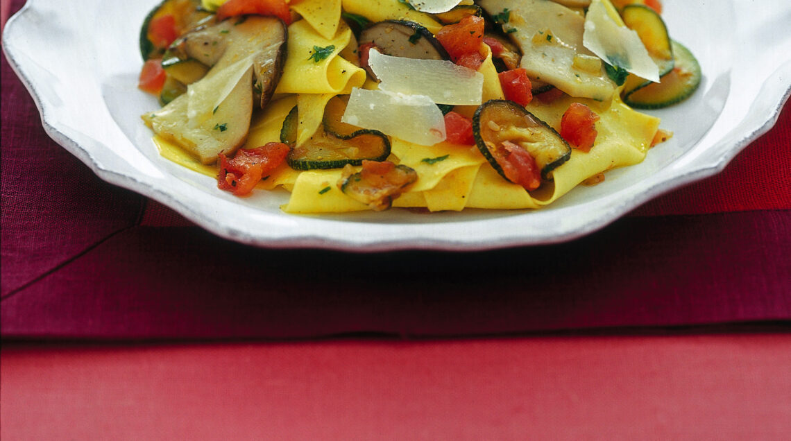 5) Fai appassire la cipolla in un altro tegame con l’olio rimanente, rosola i funghi per 2-3 minuti, salali, cospargili con il prezzemolo tritato e aggiungili al sugo di zucchine e pomodori.