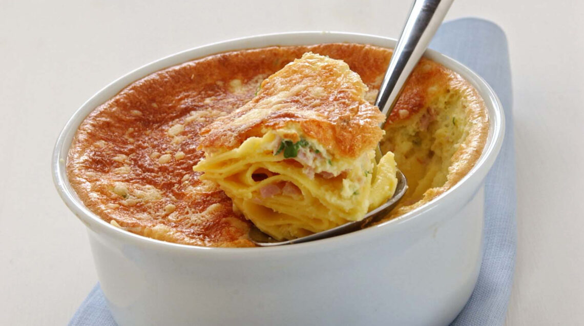 3) Prepara il condimento mescolando 2 dl di besciamella con un cucchiaio di prezzemolo spezzettato, 3 tuorli, il prosciutto cotto tritato, 3 albumi e 2 dl di panna montati.