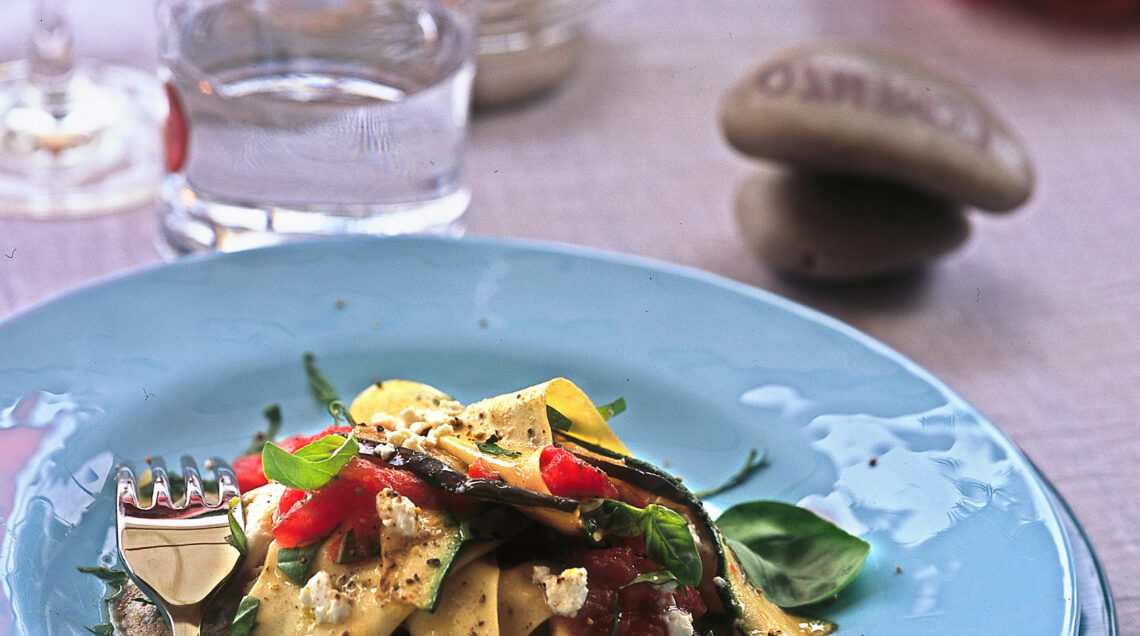 Le verdure estive come le melanzane, le zucchine e i pomodori si uniscono a tanta cremosa ricotta nel condimento di questi maltagliati tiepidi alle verdure, una fresca e gustosa ricetta vegetariana.