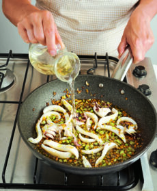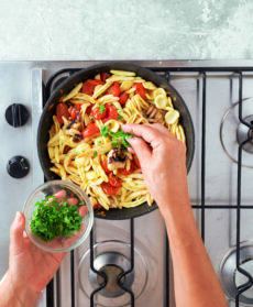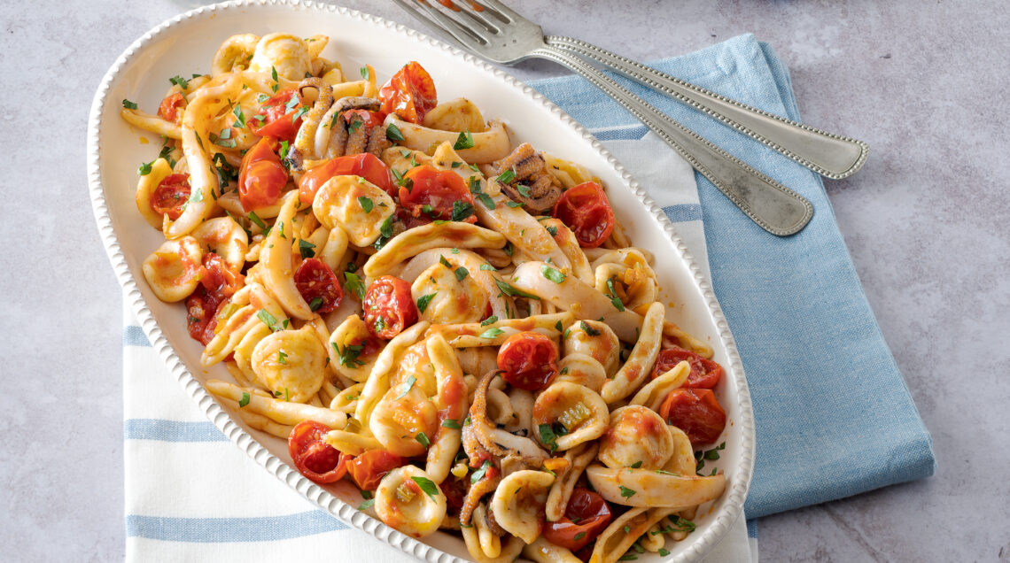 Un primo piatto di pesce dal sapore profumato, con battuto aromatico e datterini. Con mix di pasta fresca