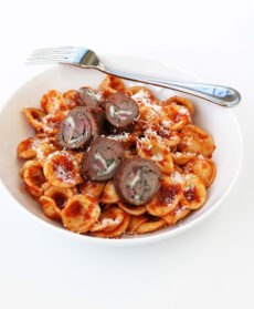 La tradizione gastronomica pugliese è legata alle consuetudini contadine come alla tipica cucina mediterranea. Ne è un perfetto esempio questa ricetta di pasta fresca di semola di grano duro, con un sugo di pomodoro e carne. Per preparare le braciolette si usa di solito polpa di cavallo: è tenera ma consistente, con una leggera dolcezza che bilancia il sapore della pancetta e del pecorino utilizzati per la farcitura. Se la carne equina non vi piace, o avete difficoltà a reperirla, potete sostituirla con fettine di vitellone o manzo: a fine cottura il sugo risulterà ugualmente saporito. Ricordate, infine, che le orecchiette condite sono ottime anche il giorno dopo: se avanzano, fatele saltare a fuoco vivo in una padella antiaderente per qualche minuto, finché si sarà formata una crosticina dorata. Oppure, spolverizzatele con una grattugiata di ricotta salata e passatele sotto il grill.