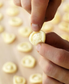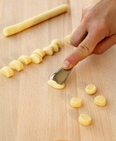 Iniziate a impastare la semola di grano duro con acqua tiepida e salata fino a ottenere una pasta piuttosto soda. Staccate un pezzetto di pasta ricavandone un bastoncino (avvolgete in un tovagliolo la pasta che rimane in attesa). Con un coltello dalla punta arrotondata, tagliate il bastoncino a tocchetti di circa 1 cm e, con il pollice, strascicate la pasta sulla spianatoia, rovesciandola, per ottenere una forma a conchiglietta.