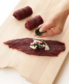 Nel frattempo, preparate il sugo. Tritate aglio e prezzemolo, riducete a pezzetti la pancetta e ascaglie il pecorino. Stendete le fettine di carne di cavallo sul tagliere, battetele con il batticarne, salatele leggermente e pepatele. Farcitele con un po' di pancetta, pecorino a scaglie e trito di prezzemolo e aglio. Arrotolate le fettine formando gli involtini e legateli con spago da cucina.