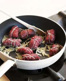 Fate rosolare la cipolla, spellata e affettata, in una padella con 3 cucchiai di olio. Unite gli involtini e rigirateli da ogni parte. Bagnate con il vino che lasciate evaporare. Salate, pepate e alzate la fiamma finché il vino è quasi completamente evaporato.