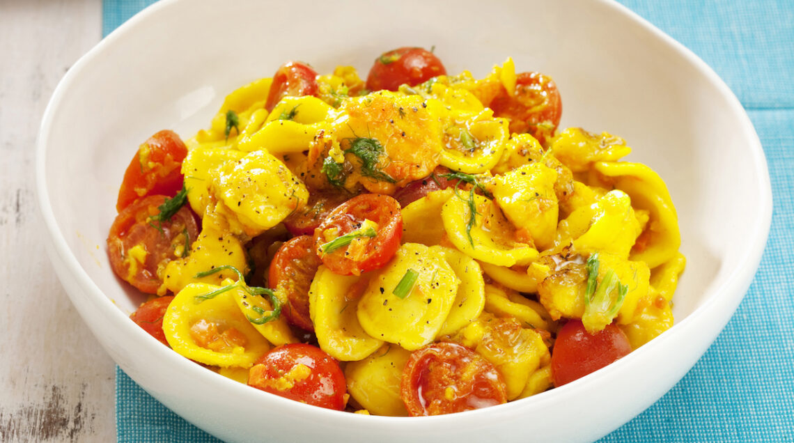 Un primo piatto creativo dal colore dorato e dal sapore caratteristico di un pesce pregiato. Per una cena estiva tra amici