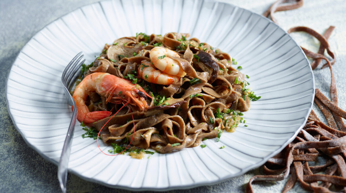 Primo piatto gustoso, queste pappardelle sono realizzate con il caffè. Ricetta salate, l'impasto si realizza velocemente e viene poi arricchito con scalogno, funghi e gamberoni