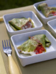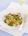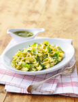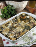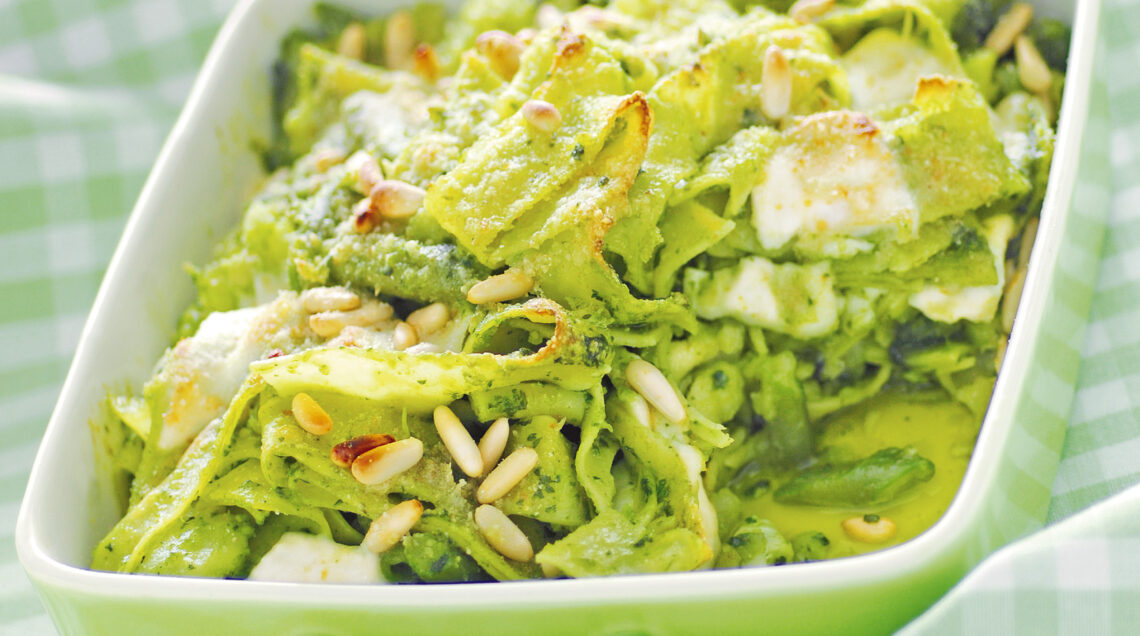 3) Aggiungi le pappardelle e lessale al dente; scolale, condiscile con il pesto preparato e mescola bene. Distribuiscile a strati in una pirofila alternandole con fettine sottili di formaggio primo sale.