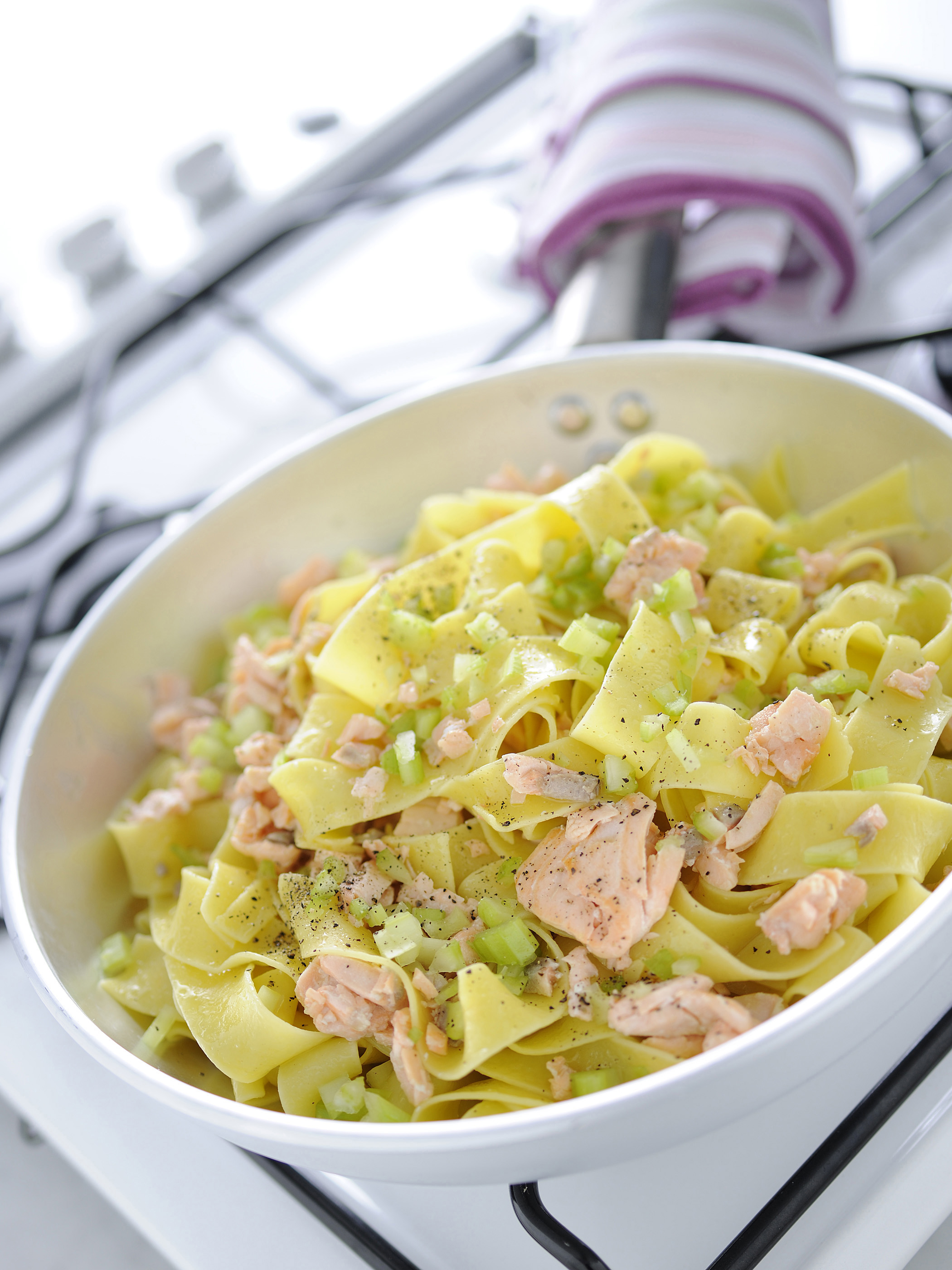 4 Cuocete le pappardelle in acqua salata. Scolatele al dente e spadellatele insieme al salmone, con poco altro olio. Unite il sedano tritato, rimescolate e servite con il crumble.