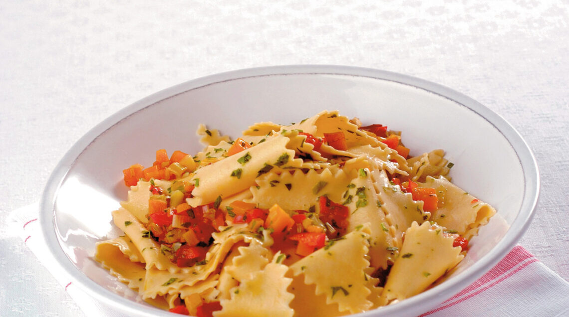 3) Stendi la pasta con la macchina in una sfoglia sottile; quindi ricava delle losanghe di 3 cm di lato con una rotella dentellata. Lessale in abbondante acqua bollente salata per circa 3 minuti. Scolale al dente e falle insaporire nella casseruola con il ragù vegetale per qualche istante. Spolverizza con il prezzemolo e servi.