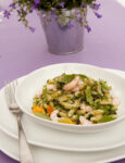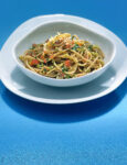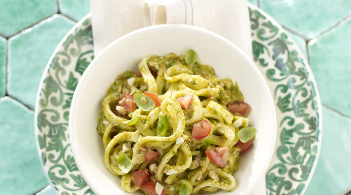 3) In una pentola, porta a ebollizione abbondante acqua salata, cuoci la pasta, scolala al dente, trasferiscila in una terrina, condiscila con il pesto preparato e unisci il pomodoro rimasto tagliato a cubetti.