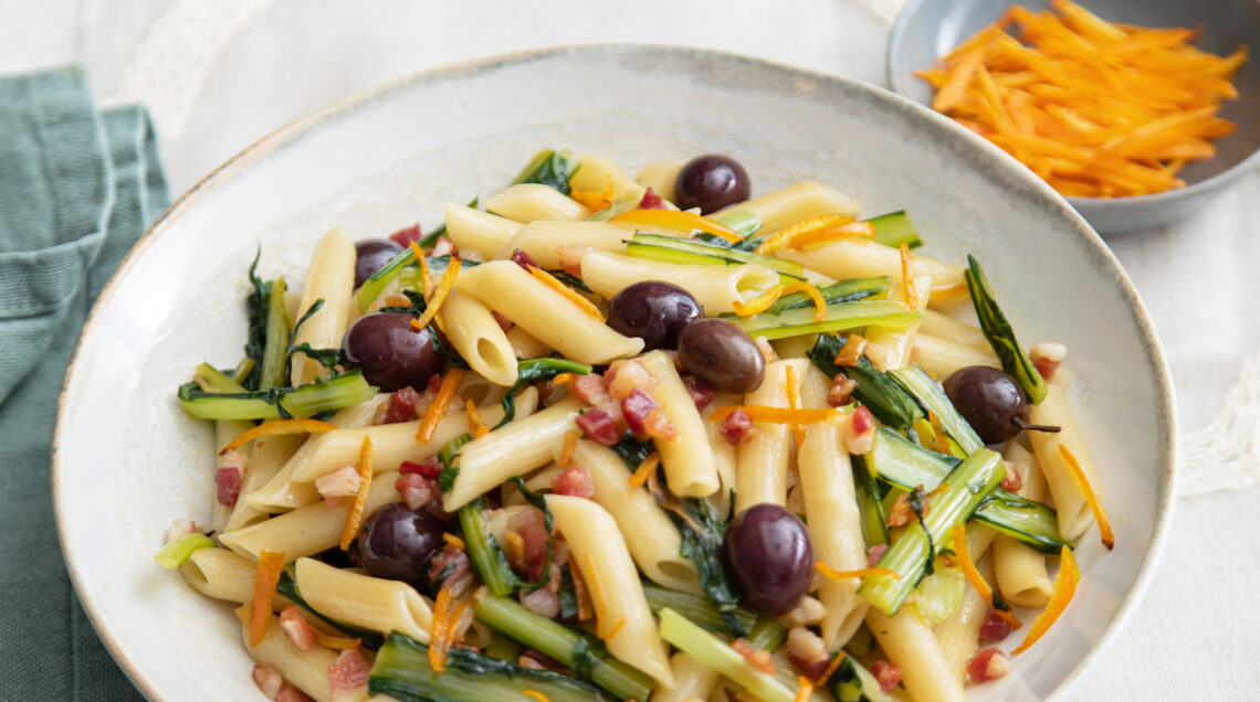 Le penne con cicoria, pancetta e olive sono realizzate con la pasta 100% di grano duro certificato Senatore Cappelli di Le Stagioni d’Italia.