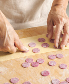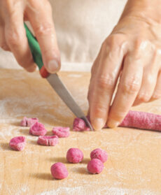 Frullate la barbabietola cotta al vapore e ricavatene 25 ml di succo filtrando la purea con un colino. Impastate il liquido con 150 g di farina, 1 uovo, 1 cucchiaio di acqua tiepida e 1 di olio. Riducete la pasta in un filoncino di 2 cm di diametro e tagliatelo in dischetti sottili.