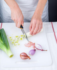 Sbucciate gli scalogni, mondate il porro, tritateli finemente e soffriggeteli con un filo di olio e 10 g di burro.