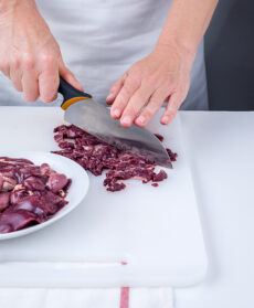 Private le rigaglie di pollo di filamenti e parti grasse, tritatele, unitele al soffritto e fatele insaporire per qualche minuto.