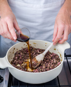 Sfumate con il brandy e il Marsala, alzate la fiamma e lasciate che l'alcol evapori completamente. Quindi aggiungete la passata di pomodoro e il brodo e lasciate cuocere per mezz'ora a fuoco dolce in modo che il sugo si restringa. Salate se necessario e pepate.
