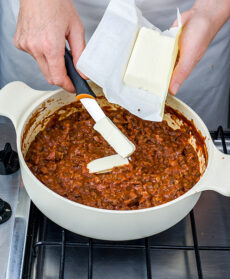 Fuori dal fuoco, mantecate il ragù con il burro rimasto. Cuocete le tagliatelle in abbondante acqua bollente salata, scolatele, rovesciatele in una terrina e conditele subito con il sugo e una manciatina di prezzemolo tritato.