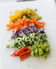 Dividi i broccoli a cimette e riduci tutte le altre verdure previste dalla ricetta degli spaghetti con verdure a dadini.