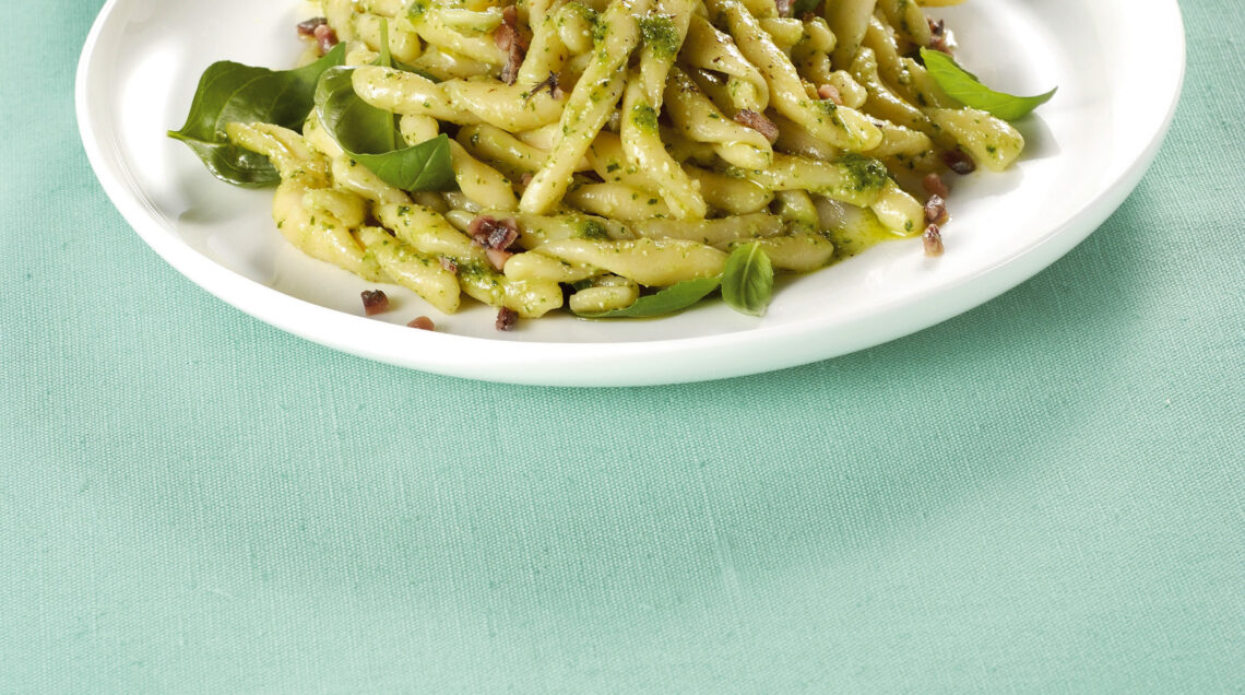 Il segreto del pesto perfetto? Sicuramente la qualità dell'olio e la freschezza del basilico, come in questi strozzapreti con pesto mediterraneo