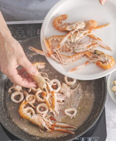 Mettete nella stessa padella i calamari tagliati ad anello con il vino bianco e cuoceteli finché saranno teneri. Quindi aggiungete gli scampi e proseguite la cottura per 2 minuti. Unite cozze e vongole, regolate di sale e fate insaporire per qualche istante.