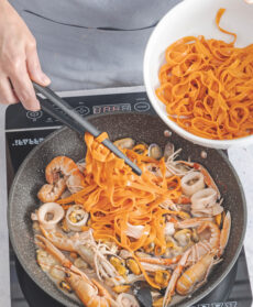 Le tagliatelle di grano saraceno con frutti di mare sono arricchite dalle zucchine, gli spaghetti con crostacei sono al pomodoro, le linguine sono allo zafferano.