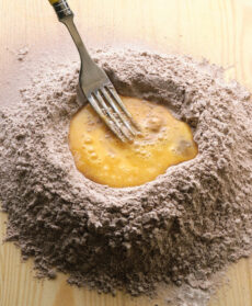 Con un cucchiaio, amalgamate perfettamente la farina e il cacao amaro, in modo che la farina assuma un colore marrone chiaro. Setacciatela quindi sulla spianatoia, formate una fontana, spolverizzatela con una presa di sale e sgusciatevi nel mezzo le uova.