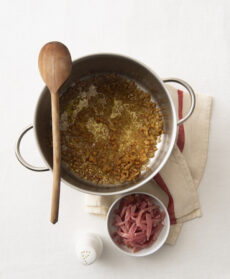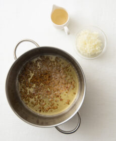 Fate sciogliere metà burro in una casseruola, tritate finemente la cipolla e trasferitela nella casseruola con il burro e il grasso del prosciutto tritato. Fate rosolare a fuoco dolce per circa 15 minuti, aggiungendo via via qualche cucchiaio di vino bianco, per evitare che la preparazione si asciughi troppo. A fine cottura unite il prosciutto a listarelle, fate insaporire per pochi istanti e spolverizzate con un'abbondante macinata di pepe.