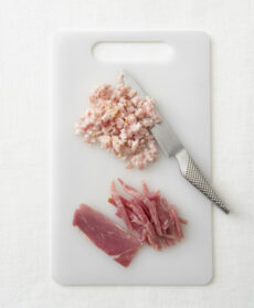 Separate con un coltello ben affilato la parte grassa e quella magra del prosciutto crudo, tagliato a fette spesse. Tritate grossolanamente la prima e riducete a listarelle non troppo sottili la seconda.