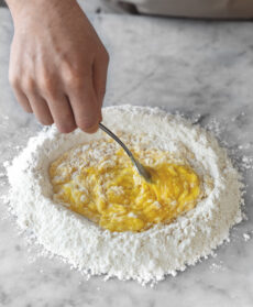 Disponete la farina a fontana, rompete le uova al centro, mescolate con una forchetta e unite una presa di sale.