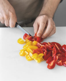 Mondate i pomodorini, eliminate il picciolo e tagliateli a spicchi.