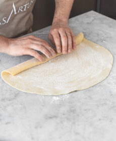 Nel frattempo tirate la sfoglia con il matterello, arrotolatela e stendetela di nuovo fino allo spessore desiderato.