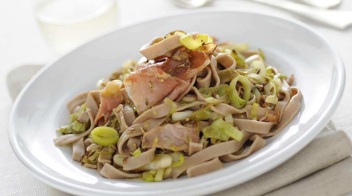 Un primo piatto rustico a base di pasta fresca fatta in casa e condito con i sapori decisi dei porri e dello speck. Una ventata mediterranea arriva dai semi di finocchio