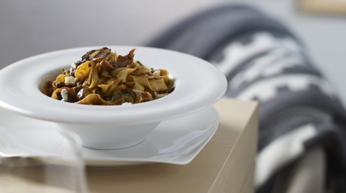 Un primo piatti gustoso e saporito; la pasta fatta in casa con farina di ceci incontra carne di selvaggina, porcini e formaggio di capra