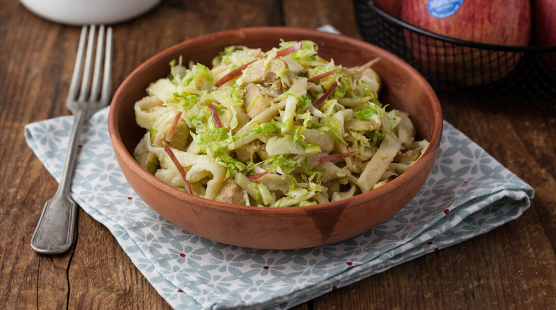 Tagliatelle fresche screziate con mele Fuji e cavolini alla senape