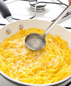 Rosolate il prosciutto in padella con pochissimo burro, poi prelevalo e tienilo da parte. Aggiungete in padella la metà del burro rimasto, fatelo sciogliere e poi spegnete. Lessate i tagliolini in abbondante acqua bollente salata: verso fine cottura, prelevate 2 mestoli di acqua e tenetela da parte.